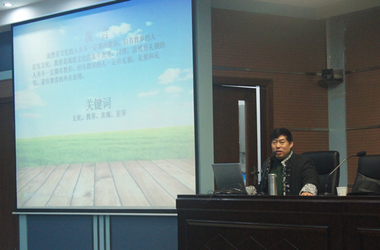 12月8日晚上,我校艺术系特邀河南大学特聘教授、河南省社科专家高谦老师,在3号实训馆学术报告厅举办了一场以“文化与教养”为主题的讲座。艺术系师生聆听了讲座。