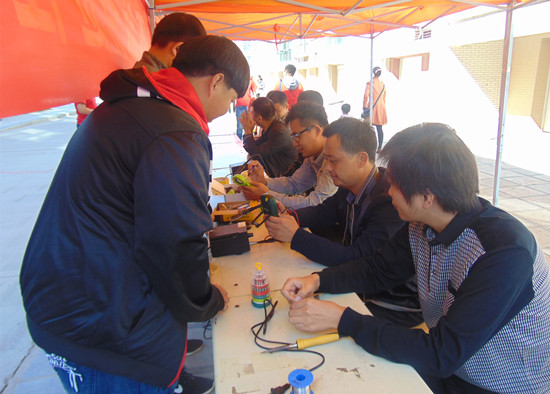 据悉,本次活动的技术人员来自该系的电子协会,他们拥有扎实的理论知识和较高的专业技能。活动一开始就吸引了许多居民前来咨询。随后,他们纷纷回到家中将已坏的玩具、台灯、电风扇等小电器拿来维修。师生耐心给居民讲解,向其介绍小电器的维修常识;拿到坏旧的电器后,师生们不慌不忙,仔细询问情况,寻找解决办法。一个个坏了的电器在其精心检查、认真维修后重新恢复工作。该系师生的服务热情和技术能力得到了居民的一致称赞。