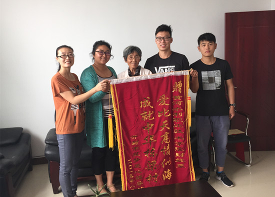 9月10日上午,开封市“筑梦爱心辅导站”负责人刘传真老人专程来到我校,将写着一面“爱比天高情似海,成就中华栋梁才”的锦旗送到财经系。该系党总支副书记胡晓慧、分团委书记郝瑶、辅导员李灿及相关学生干部等热情接待了老人。