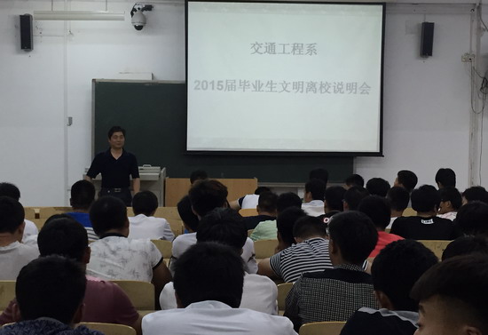 又到学生毕业季,又是一年分别时。为了更好的了解和解决毕业生在离校前遇到的困难,号召大家安全、文明、有序离校,6月2日晚,交通工程系在JX2102召开2015届毕业生文明离校说明会。该系主任务新超,党总支副书记焦东良,2012级辅导员史晋、杨志刚及2015届毕业生参会。