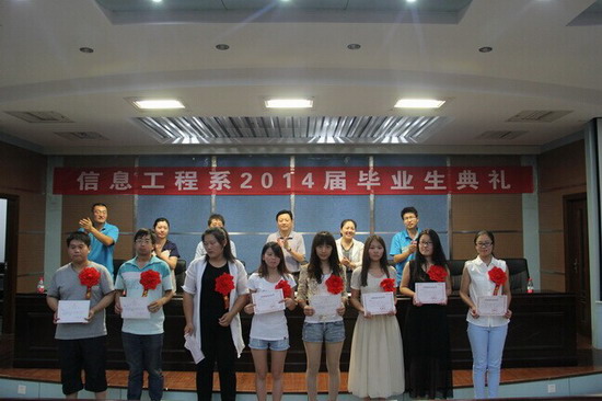 6月10日下午15:00,信息工程系在院3号实训馆学术报告厅召开2014届毕业生毕业典礼。系党总支书记刘岩、系主任丁爱萍、系党总副书记殷莺、系副主任吕振雷、网络教研室主任曹建春、分团委书记员彭战松、2012级辅导员张哲,2014届全体毕业生参加毕业典礼。典礼由系分团委书记彭战松主持。