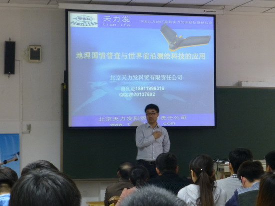 3月28日上午9:00,测绘工程系在JX6101举行EBee航测无人机外业数据采集培训,北京天力发科贸有限公司赵树田总经理、技术总监曲良进以及该公司其他随同人员就航测无人机在地理国情普查与世界前沿测绘科技的应用做了培训,并在我院东南体育场现场演示了EBee航测无人机外业数据的获取。