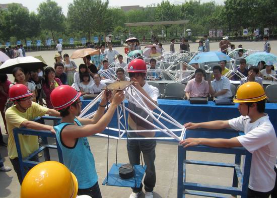 5月6日上午,由河南大学,开封大学、黄河水利职业技术学院三校联办的第二届结构设计大赛在河南大学土建学院广场上火热展开。