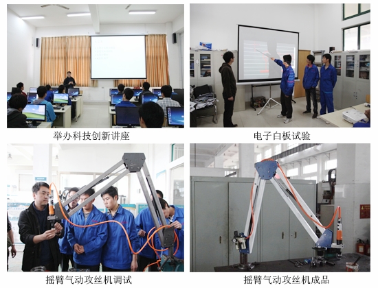 “投影幕变成了‘触摸屏’”、“会乘法计算的青蛙”、“光电寻迹机器小车”、“智能导盲手杖”,这些不是哪家企业的攻关项目,而是我院机电系师生的科技创新成果。自后示范建设工作启动以来,该系师生已完成科技创新制作成果8项,其中“浮动叶片式流体发电机”、“智能导盲手杖”项目正在申报国家专利,“摇臂气动攻丝机”项目已有两家企业要求订购。