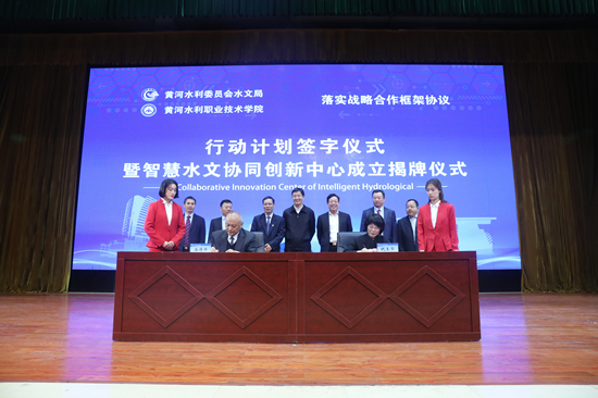 11月2日,黄河水利职业技术学院(以下简称“黄河水院”)与水利部黄河水利委员会(以下简称“黄委”)水文局共建的“智慧水文协同创新中心”(以下简称“中心”)签约揭牌仪式,在学生活动中心报告厅举行。中国水利教育协会会长黄河,河南省教育厅副巡视员李金川,黄河水利委员会水文局局长谷源泽、党组书记贺树明,河南省教育厅科技处正处级调研员杨学勇,黄河水文科技有限公司董事长、总经理张永平,黄河水院党委书记许琰,党委副书记、校长祝玉华,副校长杨士恒,党委副书记刘卫锋,副校长焦爱萍等出席签约揭牌仪式,黄委水文局相关部门负责人、完美网页版全体中层干部及水利工程学院部分师生代表参加仪式,仪式由焦爱萍主持。