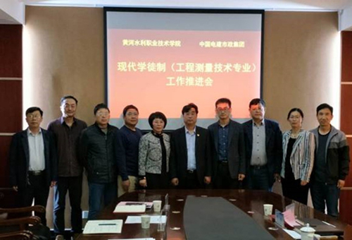 4月10日,黄河水利职业技术学院(以下简称“黄河水院“)教育部现代学徒制试点(工程测量技术专业)工作推进会在行政楼第四会议室召开。校长祝玉华,以及党政办公室、科技处、教务处、招生就业服务中心、测绘工程学院等部门负责人;中国电建市政建设集团有限公司(以下简称“该公司”)总经理助理于杰、人力资源部科长曹培军等参加了会议。会议由测绘工程学院院长陈琳主持。