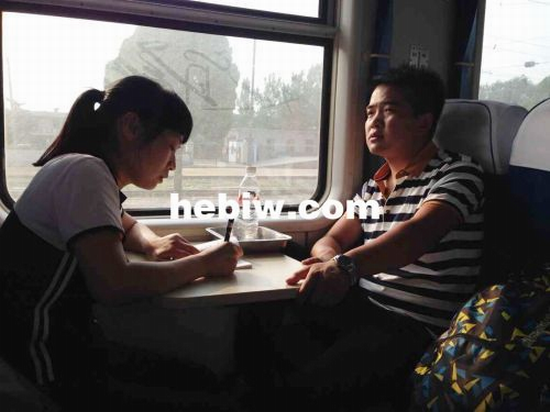 7月9日,邢二朋(右)在列车上接受记者采访。(鹤壁网新闻记者 董丹 摄)