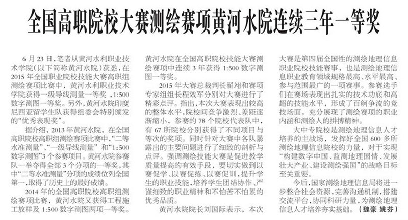 上一条:东方今报:全国高职院校大赛测绘赛项 “黄河水院”连续三年获一等奖