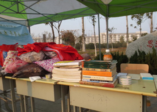 同学们搭起防晒棚,摆上宣传板,号召同学们前来捐献衣物