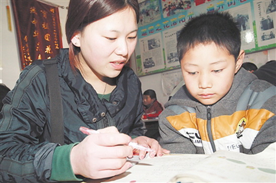 4月19日,黄河水利职业技术学院的学生在筑梦爱心辅导站辅导留守儿童学习。3年来,该院的学生每月定期利用休息日来到筑梦爱心辅导站辅导孩子学习,为留守儿童献爱心。 《汴梁晚报》记者 李克君 摄